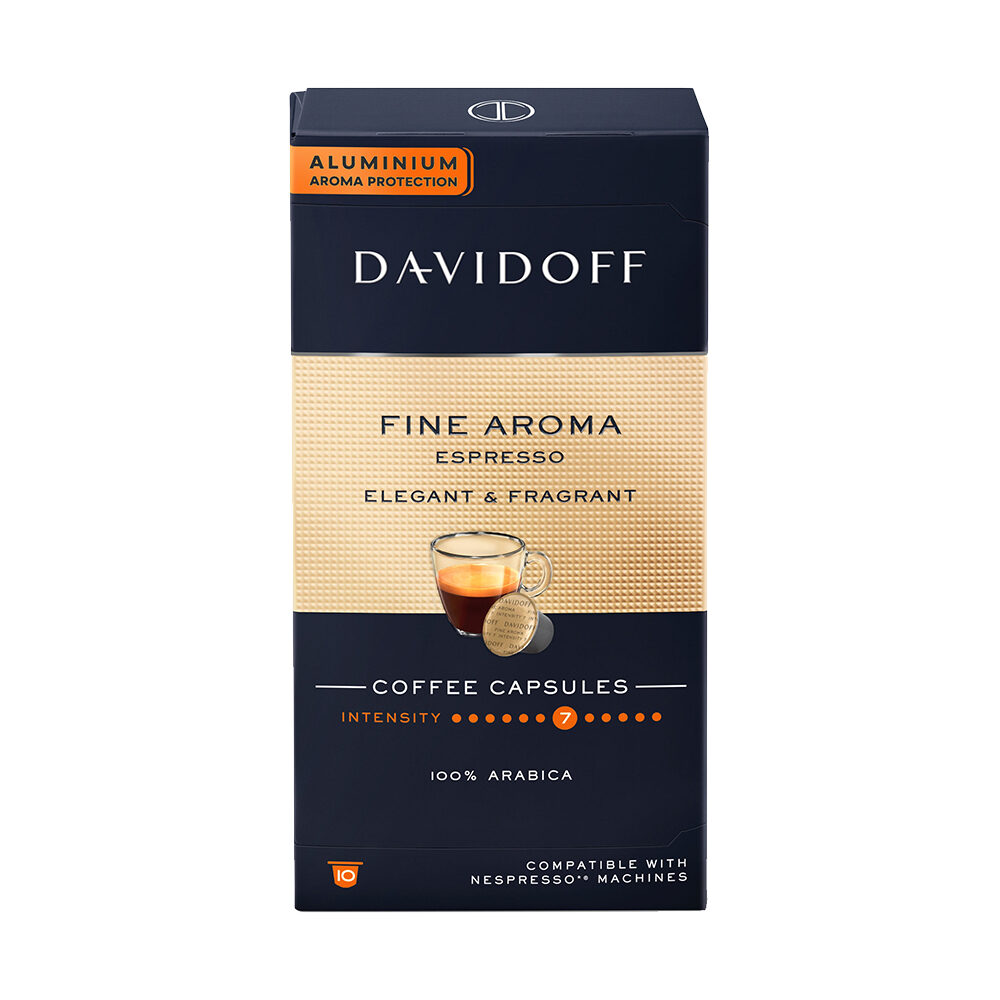 Κάψουλες Davidoff Fine Aroma (10 τεμ.), συμβατές με μηχανές Nespresso, με 100% Arabica χαρμάνι για κομψό espresso με διακριτικές φρουτώδεις νότες, μεσαίο σώμα και απαλή, ντελικάτη επίγευση.
